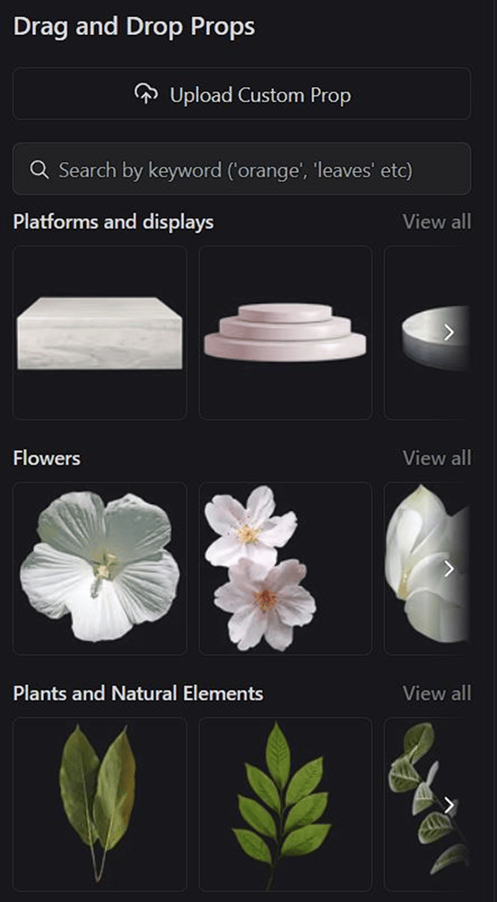 Kolejną wyróżniającą się opcją w module „drag & drop” są elementy, które możemy dodać do naszego obszaru roboczego. Mamy tutaj naprawdę szeroki wybór. W bibliotece znajdziemy różne elementy, takie jak platformy, na których możemy postawić nasz produkt, elementy związane z naturą, takie jak liście czy kwiaty lub coś całkowicie innego, jak np. zwierzęta.