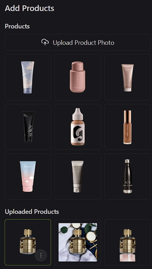 Pierwszą opcją są produkty: W tym miejscu mamy wybór dotyczący produktów. Jeżeli na początek chcemy się pobawić tym narzędziem, przetestować, zobaczyć, jak działa, to możemy wybrać sobie produkt, który jest już wygenerowany dla testów. Tych produktów mamy do wyboru 9 i są to produkty głównie z branży kosmetycznej. Nie musimy skupiać się jednak tylko na testowych produktach, bo to nie miałoby za bardzo sensu. Możemy oczywiście dodać swój produkt, na którym chcemy pracować. Po załadowaniu zdjęcia naszego produktu pojawi się możliwość usunięcia tła. Warto mieć tutaj przygotowane kilka zdjęć z różnych perspektyw, kątów, etc. Lepiej się będzie po prostu pracować, mając różne możliwości.