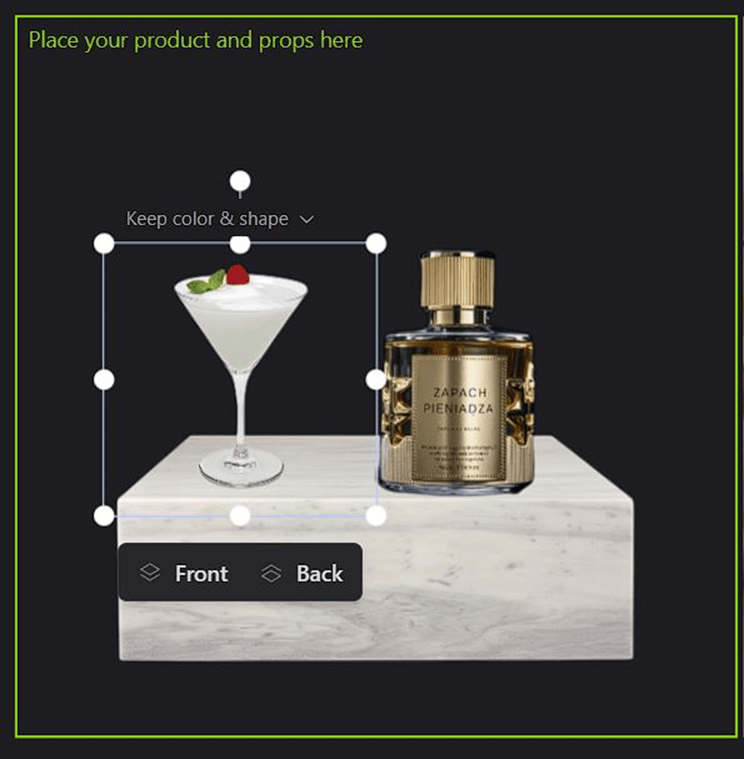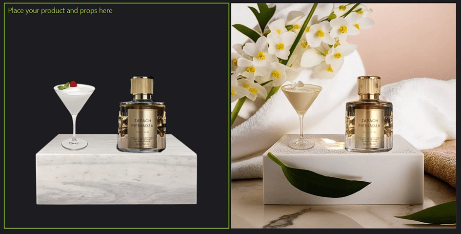 A tak wygląda jeden z efektów działania tego narzędzia. Po lewej stronie widzimy obszar roboczy. Na początek dodany został produkt, z którego usunięto tło. Następnie pojawiła się platforma, na której zostały umiejscowione perfumy a obok nich drink. Ostatnim elementem całej układanki był prompt, który wygenerował scenerię oraz ważny aspekt, o którym wspomniałem wcześniej – zostawił również na obrazie elementy, które dodałem do obszaru roboczego. Wygenerowany obraz możemy oczywiście pobrać. Wystarczy kliknąć prawym przyciskiem myszy i wybrać „Download”.