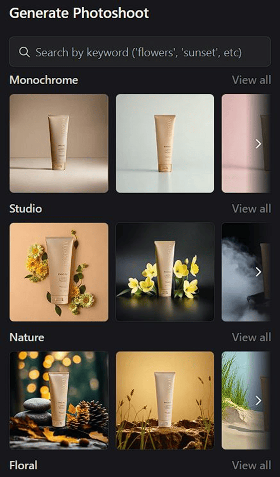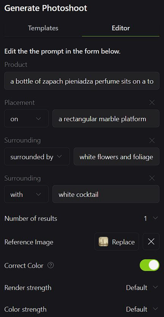 Teraz czas na coś lepszego – generowanie „photoshootów” dla naszego produktu. W tym miejscu pojawia się mnóstwo różnych szablonów podzielonych na kategorie. Wystarczy, że klikniemy dany obraz, a prompt zostanie przeniesiony do przeznaczonego na to miejsca. I to, co jest najlepsze w tym momencie to to, że jeżeli dodaliśmy wcześniej jakieś elementy do naszego obszaru roboczego, a teraz użyjemy prompta opisującego scenerię, to te elementy zostaną zachowane i dostosowane pod prompt i scenerię. I to jest właśnie piękne. Oprócz tego mamy również możliwość „ręcznego” dostosowywania promptów. Edytor podzielony jest na poszczególne kategorie, gdzie za pomocą opisu możemy je dostosowywać.